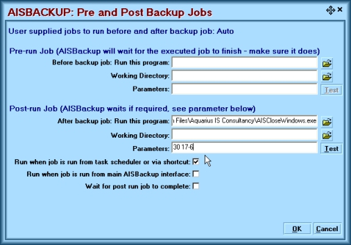 AISBackup has no built in support for automatically closing down the PC after a backup finishes, however, the post run job may be used to perform this function.