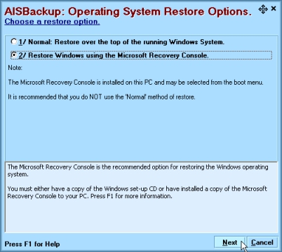 If the core operating files have been replaced between the chosen restore point and the current operating system then the restore method choice dialogue requests that the recovery console method is used, other wise you may choose between 'over the top' or recovery console method. As mentioned above, if the pre-installed environment BartPE has been set-up with the AISBackup plug-in then this method may be used to restore the backup instead of the Microsoft Recovery Console.