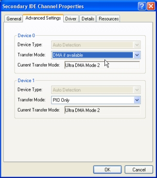 3. Select the appropriate device number and set the Transfer Mode setting to DMA if available (recommended) or PIO Only (use this setting on nly if DMA mode repeatedly fails).