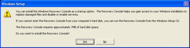 As an alternative to copying the Recovery Console files to your hard drive you may boot the Recovery Console directly from your Windows installation CD by choosing the Repair option.