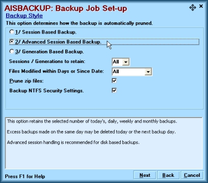 Generation based backup’s are useful when you are automatically backing up files from certain directories throughout the day, you may elect to keep the last 3 versions of a file, whereas if you select ‘Keep the last three sessions’ you may end up with only one version of a particular file.