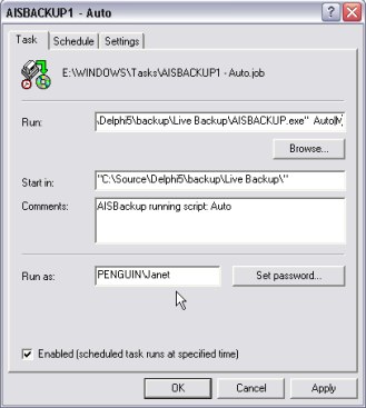 To check that the run time parameters are set correctly select, copy and paste the contents of the Run: edit box into the Windows Start / Run option, then click OK to run AISBackup.