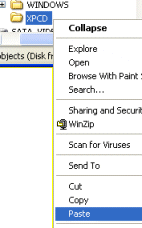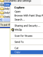 - Either from the installation CD or \I386 folder, copy the folder to C:\XPCD, be careful not to move the contents from a disk based I386 folder by using the right click Copy and Right Click Paste commands, see below.