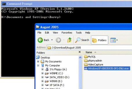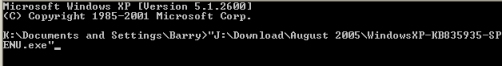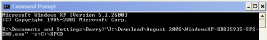 After dragging and dropping WindowsXP-KB835935-SP2-ENU.exe to the command prompt the command prompt will look something like this: