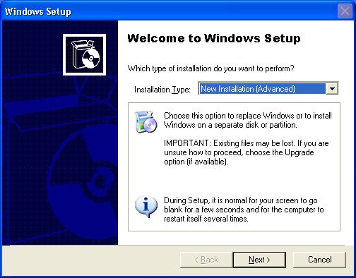 Important: Change the install option to New Installation (Advanced).
