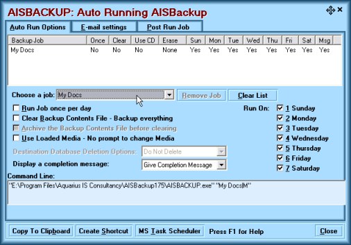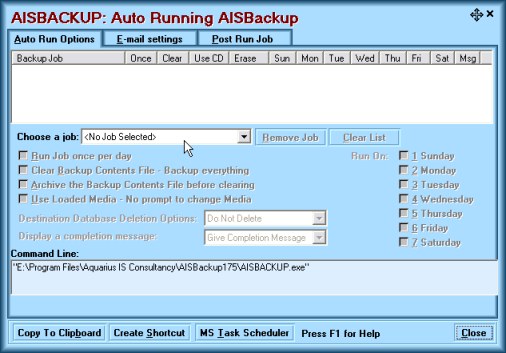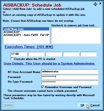 Also note Windows NT, 2000 and XP users should manually run the job at least once while logged on to the 'Scheduled Job User' to ensure that AISBackup accesses the correct backup job and database folders.