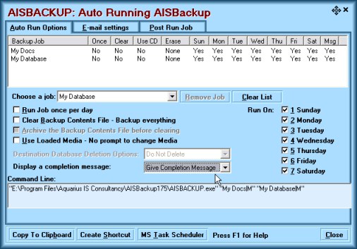 You have two backup jobs that you want to run after midnight, the first job is called MYDOCS and you want this job to run every day. The second job is called MYDATABASE and you want this to run on Mondays and Thursdays only. Both jobs are directed to CD and both jobs want to use the same CD, AISBackup is to use the loaded CD and not prompt for one. A completion message is to be left on the screen when AISBackup finishes.