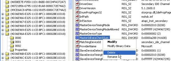 Choose each of the 0000, 0001 and 0002 sub keys in turn and use the DriverDesc value name to identify the primary or secondary IDE channel. If you are not sure which your device is connected to and you do not mind Windows re-detecting the appropriate mode for all of your drives then follow the instructions for both channels, Master and Slave.