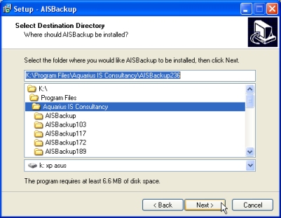 Select the destination folder, note that the installation program automatically appends the folder name AISBackup so if you select the pre-existing folder name AISBackup the install folder will be ....\AISBackup\AISBackup, which is probably not what is intended.