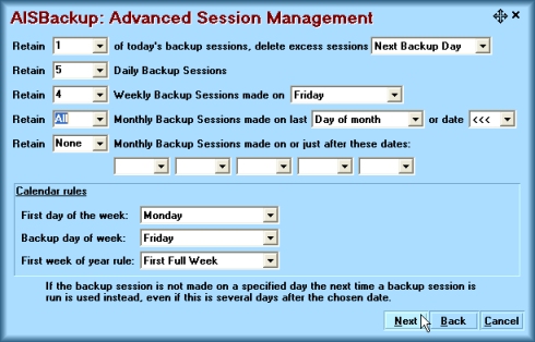 Retain Backups made on a specified day: Specifies up to 5 specific days of the month for which backups should be retained. This option may be useful to retain backups made after special mid-month processing etc. If a backup session is not made on the specific day the next daily backup is used instead.