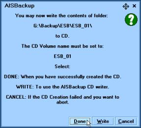 - Read the next prompt for instructions on how to create the first/next CD. If the AISBackup CD Writer has been activated then you may choose to use it instead of a third party CD Writer by clicking Write. Do not click Done until the CD has been created....