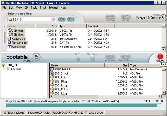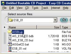 Change the name of the CD to that requested in the AISBackup prompt, in this example the first CD is called ESB_01. (If you forget this step the restore will still work).