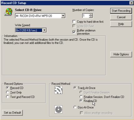 - Select the Write speed appropriate to the CD inserted, ensure that Finalize CD is selected then click Start Recording.