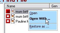 Alternatively, if you would like to restore the file directly from the find form, right click the file name and either choose Open, Open with or Restore to.