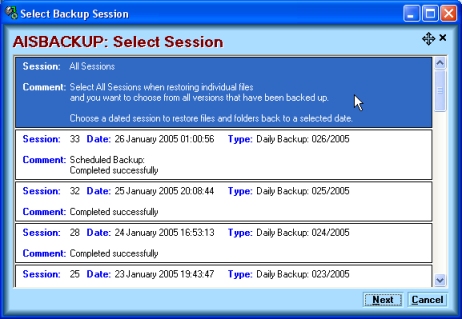 If you intend to restore all files back from a certain date then choose a dated session from the drop down list. If you are restoring one or more individual files from the whole backup leave the selection on All Sessions as shown above.